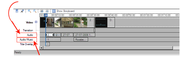 To add extra sound to the movie, import and drag an MP3 file or other audio file (one that is suitable for the editing program) to the bar "Audio / Music":